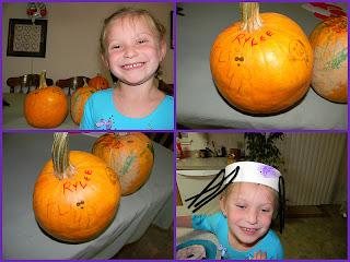 Ashlyn with her pumpkin and Rylee's preschool pumpkin. She made the picture on the bottom. She liked the stickers too, but I don't think as much as Rylee!